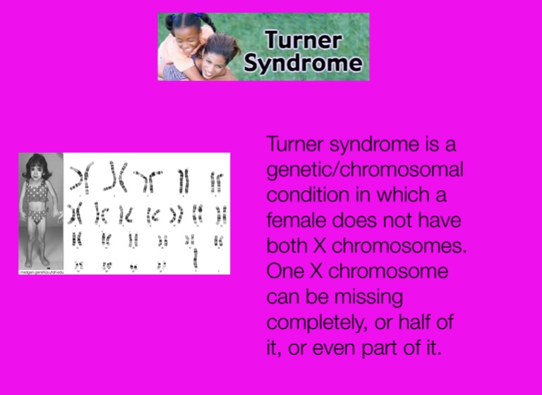 Turner syndrome is a genetic/chromosomal condition in which a female does not have both X chromosomes. One X chromosome can be missing completely, or half of it, or even part of it.