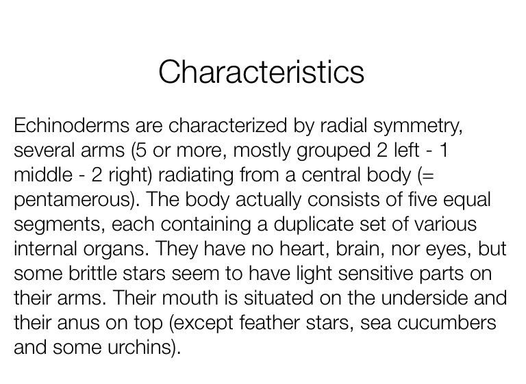 Echinoderms are characterized by radial symmetry, several arms (5 or more, mostly grouped 2 left - 1 middle - 2 right) radiating from a central body (= pentamerous). The body actually consists of five equal segments, each containing a duplicate set of various internal organs. They have no heart, brain, nor eyes, but some brittle stars seem to have light sensitive parts on their arms. Their mouth is situated on the underside and their anus on top (except feather stars, sea cucumbers and some urchins).