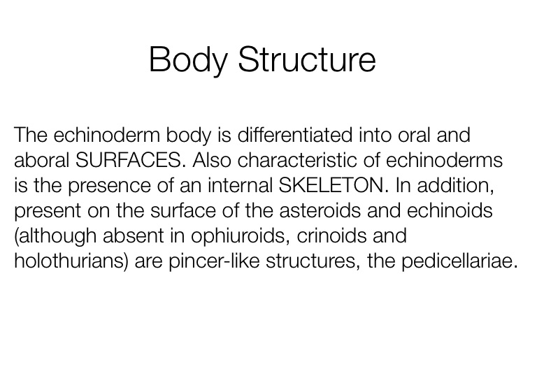 The echinoderm body is differentiated into oral and aboral SURFACES. Also characteristic of echinoderms is the presence of an internal SKELETON. In addition, present on the surface of the asteroids and echinoids (although absent in ophiuroids, crinoids and holothurians) are pincer-like structures, the pedicellariae.