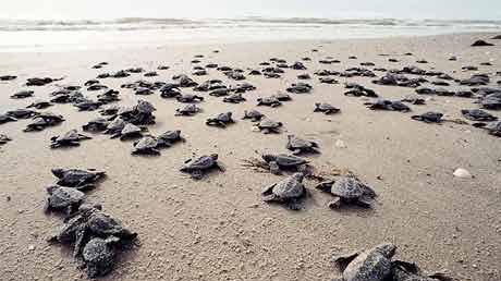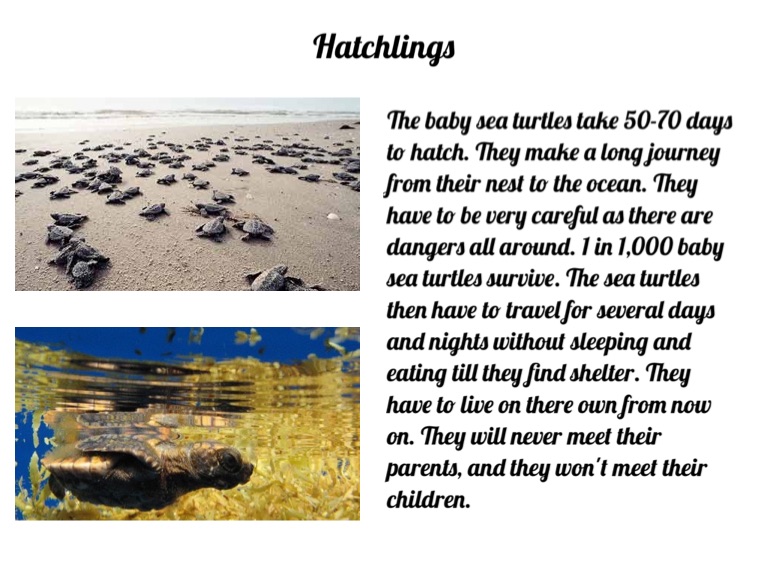 The baby sea turtles take 50-70 days to hatch. They make a long journey from their nest to the ocean. They have to be very careful as there are dangers all around. 1 in 1,000 baby sea turtles survive. The sea turtles then have to travel for several days and nights without sleeping and eating till they find shelter. They have to live on there own from now on. They will never meet their parents, and they won't meet their children.