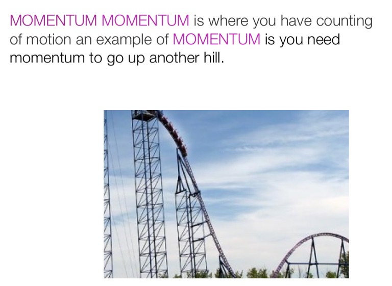 MOMENTUM MOMENTUM is where you have counting of motion an example of MOMENTUM is you need momentum to go up another hill.