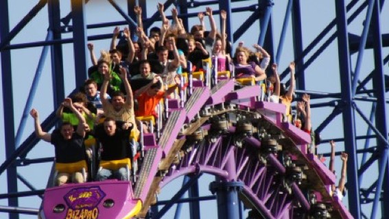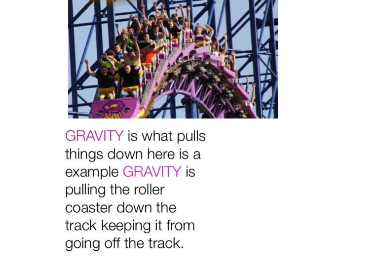 GRAVITY is what pulls things down here is a example GRAVITY is pulling the roller coaster down the track keeping it from going off the track.