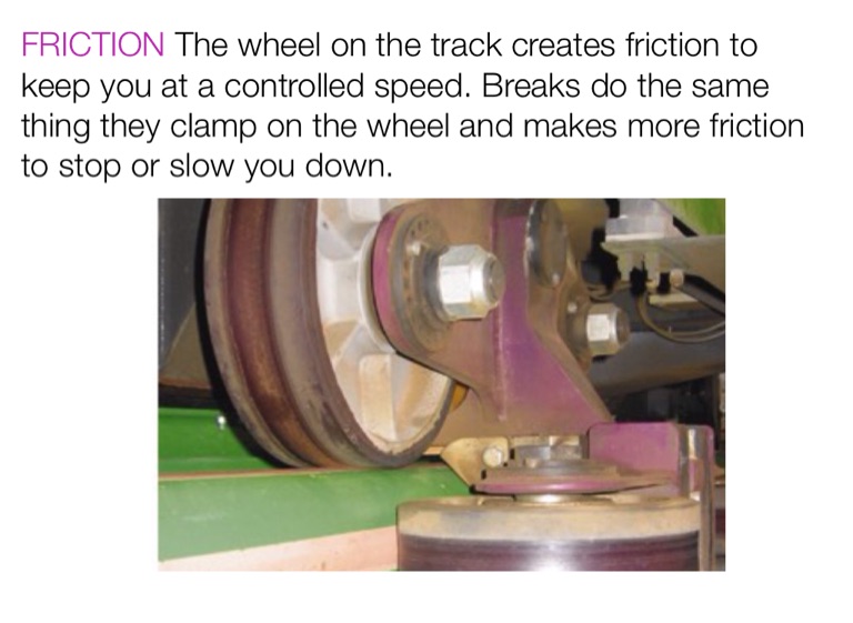 FRICTION The wheel on the track creates friction to keep you at a controlled speed. Breaks do the same thing they clamp on the wheel and makes more friction to stop or slow you down.
