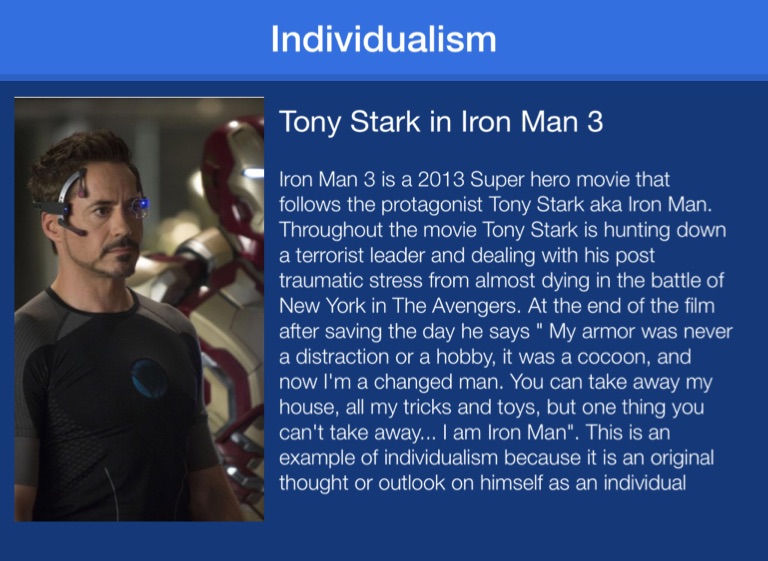 Iron Man 3 is a 2013 Super hero movie that follows the protagonist Tony Stark aka Iron Man. Throughout the movie Tony Stark is hunting down a terrorist leader and dealing with his post traumatic stress from almost dying in the battle of New York in The Avengers. At the end of the film after saving the day he says " My armor was never a distraction or a hobby, it was a cocoon, and now I'm a changed man. You can take away my house, all my tricks and toys, but one thing you can't take away... I am Iron Man". This is an example of individualism because it is an original thought or outlook on himself as an individual