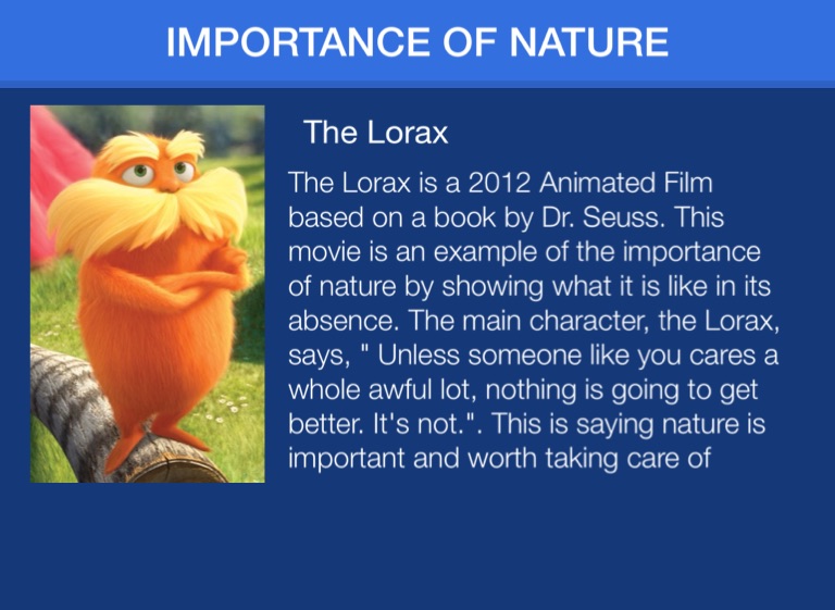 The Lorax is a 2012 Animated Film based on a book by Dr. Seuss. This movie is an example of the importance of nature by showing what it is like in its absence. The main character, the Lorax, says, " Unless someone like you cares a whole awful lot, nothing is going to get better. It's not.". This is saying nature is important and worth taking care of