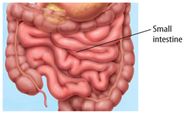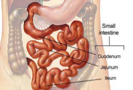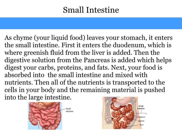 As chyme (your liquid food) leaves your stomach, it enters the small intestine. First it enters the duodenum, which is where greenish fluid from the liver is added. Then the digestive solution from the Pancreas is added which helps digest your carbs, proteins, and fats. Next, your food is absorbed into the small intestine and mixed with nutrients. Then all of the nutrients is transported to the cells in your body and the remaining material is pushed into the large intestine.