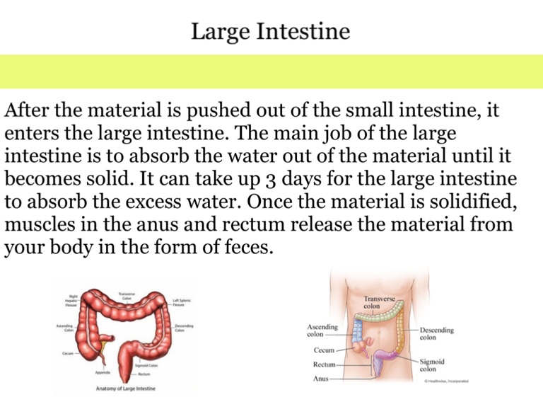 After the material is pushed out of the small intestine, it enters the large intestine. The main job of the large intestine is to absorb the water out of the material until it becomes solid. It can take up 3 days for the large intestine to absorb the excess water. Once the material is solidified, muscles in the anus and rectum release the material from your body in the form of feces.