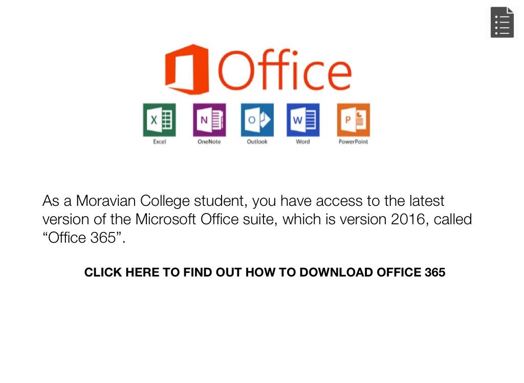 As a Moravian College student, you have access to the latest version of the Microsoft Office suite, which is version 2016, called “Office 365”.