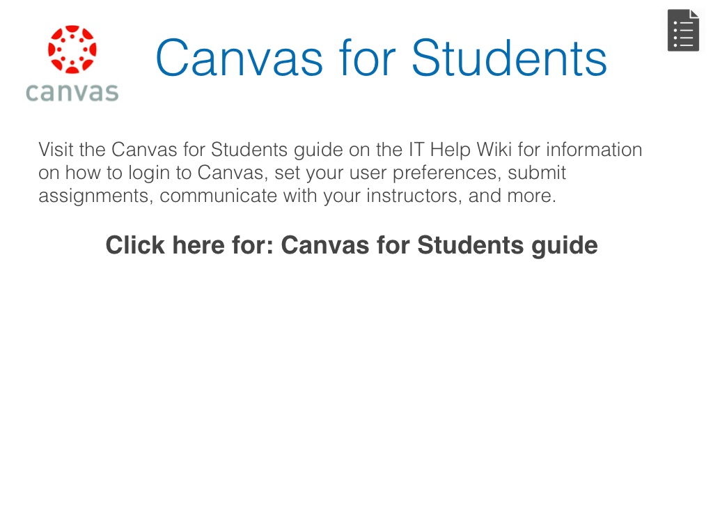 Visit the Canvas for Students guide on the IT Help Wiki for information on how to login to Canvas, set your user preferences, submit assignments, communicate with your instructors, and more.