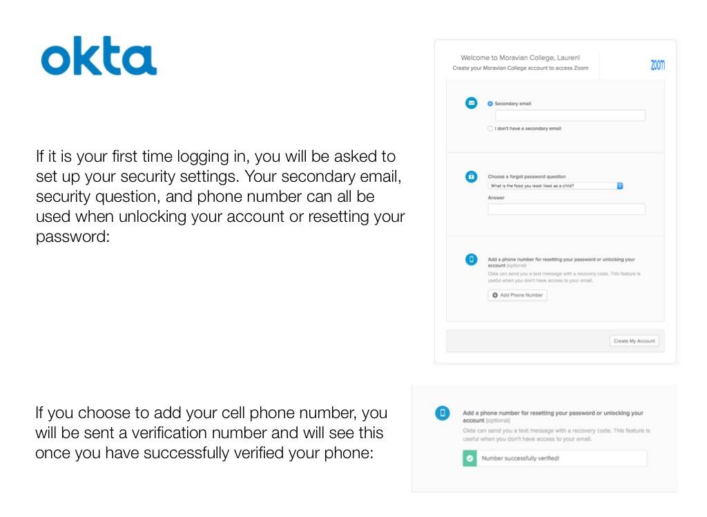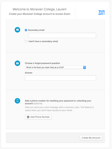 If it is your first time logging in, you will be asked to set up your security settings. Your secondary email, security question, and phone number can all be used when unlocking your account or resetting your password: