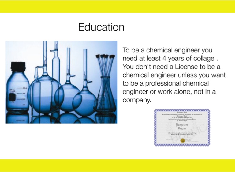 To be a chemical engineer you need at least 4 years of collage . You don't need a License to be a chemical engineer unless you want to be a professional chemical engineer or work alone, not in a company.