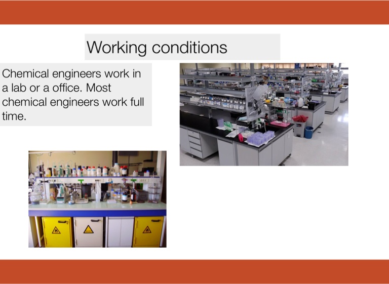 Chemical engineers work in a lab or a office. Most chemical engineers work full time.