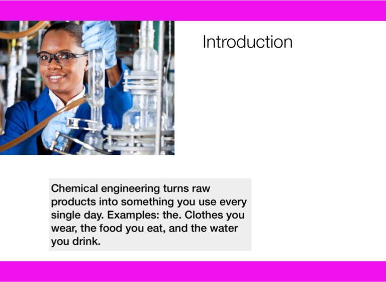 Chemical engineering turns raw products into something you use every single day. Examples: the. Clothes you wear, the food you eat, and the water you drink.