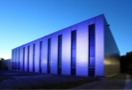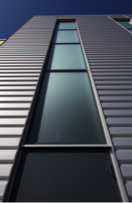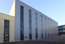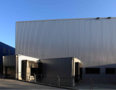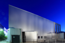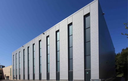 Die Fassade des an den Bestand angebauten Hochregallagers besteht aus einer Kassettenwand mit Trapezprofil als Außenschale. Die horizontale Verlegung der Trapezbleche setzt zusammen mit den wandhohen Fenstern Akzente in der Frontansicht. In den rückwärtigen Gebäudebereichen wurde die Trapezblechschale vertikal verlegt.