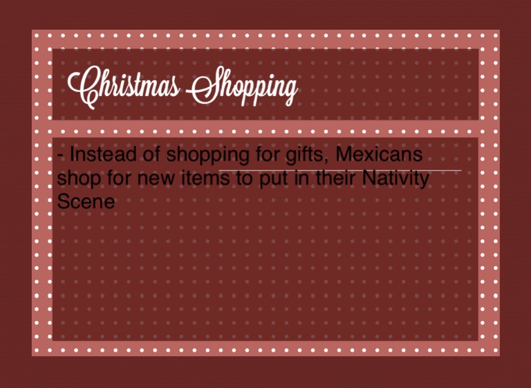 - Instead of shopping for gifts, Mexicans shop for new items to put in their Nativity Scene