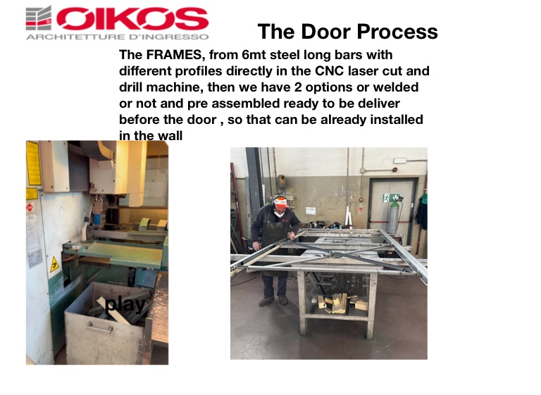 The FRAMES, from 6mt steel long bars with different profiles directly in the CNC laser cut and drill machine, then we have 2 options or welded or not and pre assembled ready to be deliver before the door , so that can be already installed in the wall