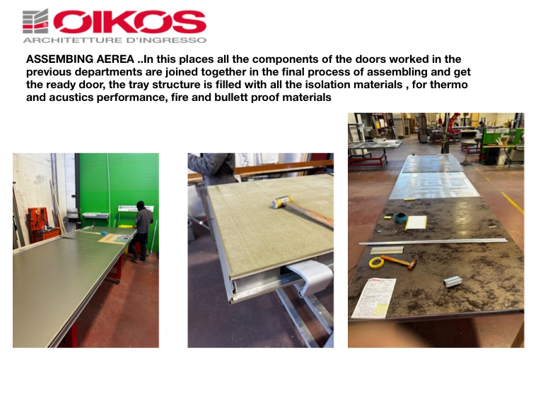 ASSEMBING AEREA ..In this places all the components of the doors worked in the previous departments are joined together in the final process of assembling and get the ready door, the tray structure is filled with all the isolation materials , for thermo and acustics performance, fire and bullett proof materials