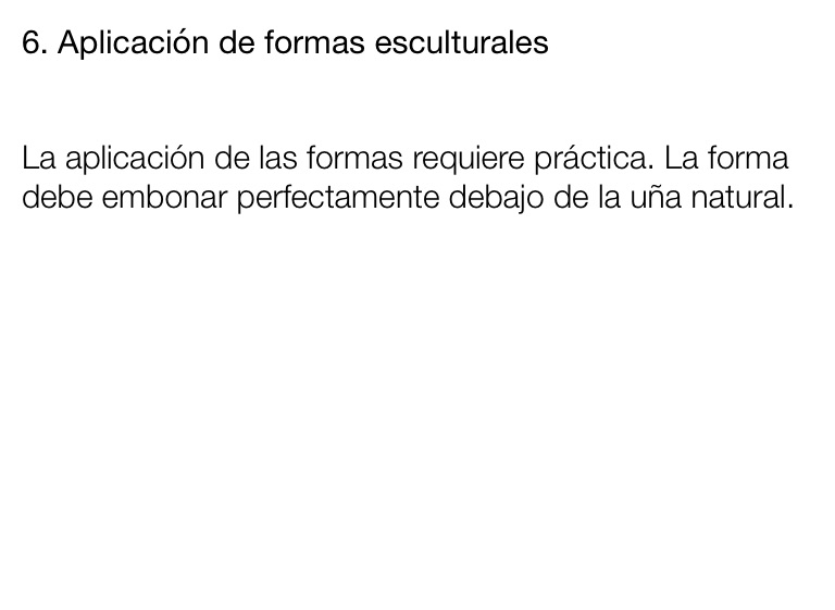 La aplicación de las formas requiere práctica. La forma debe embonar perfectamente debajo de la uña natural.