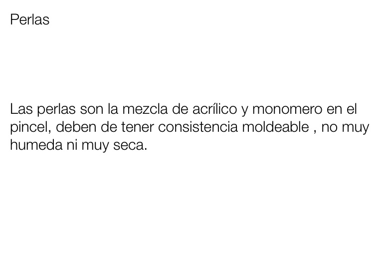 Las perlas son la mezcla de acrÃlico y monomero en el pincel, deben de tener consistencia moldeable , no muy humeda ni muy seca.
