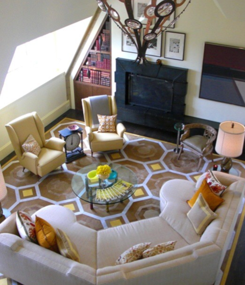 Although subtle, this example demonstrates the effect radiation can give to a room. Everything is centered and revolves around the round table. The round table is the focal point of the room and it's shape is repeated throughout in the carpet, light fixtures, pillow patterns, and the shape the furniture is arranged in. The radiating room gives the viewer a sense of unity. Here this room lets the viewer know that this room is made to bring people together and it promotes socialization.