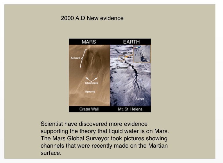 Scientist have discovered more evidence supporting the theory that liquid water is on Mars. The Mars Global Surveyor took pictures showing channels that were recently made on the Martian surface.
