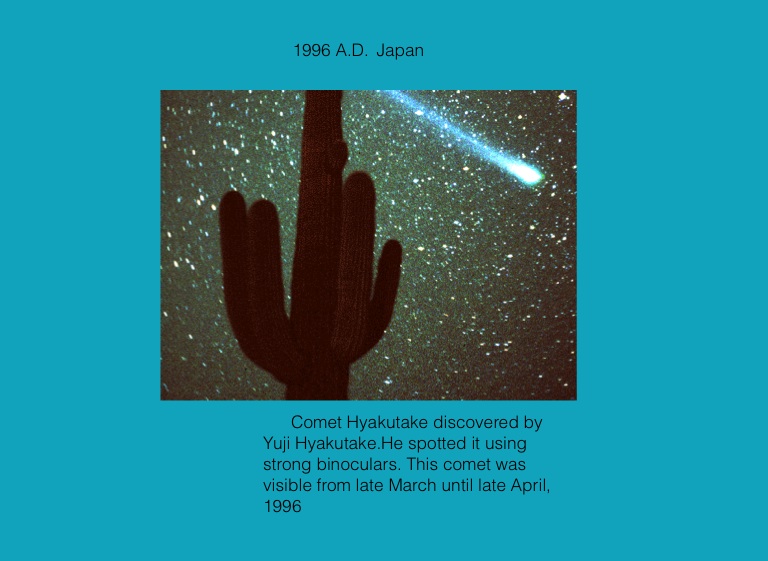 Comet Hyakutake discovered by Yuji Hyakutake.He spotted it using strong binoculars. This comet was visible from late March until late April, 1996