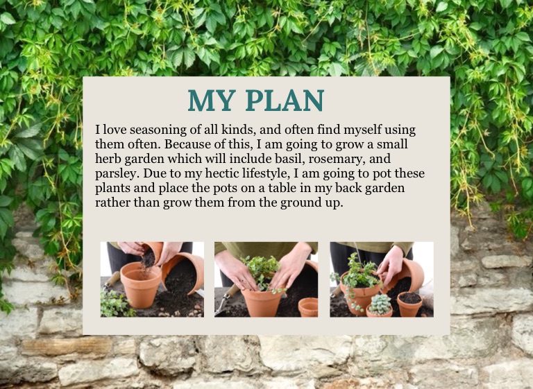 I love seasoning of all kinds, and often find myself using them often. Because of this, I am going to grow a small herb garden which will include basil, rosemary, and parsley. Due to my hectic lifestyle, I am going to pot these plants and place the pots on a table in my back garden rather than grow them from the ground up.