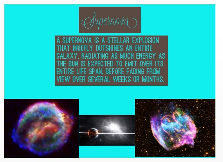 A supernova is a stellar explosion that briefly outshines an entire galaxy, radiating as much energy as the Sun is expected to emit over its entire life span, before fading from view over several weeks or months.