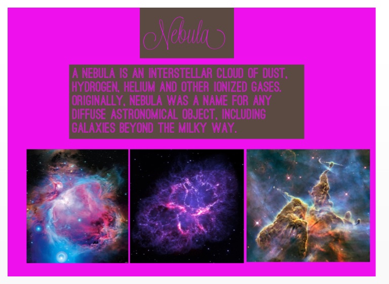 A nebula is an interstellar cloud of dust, hydrogen, helium and other ionized gases. Originally, nebula was a name for any diffuse astronomical object, including galaxies beyond the Milky Way.