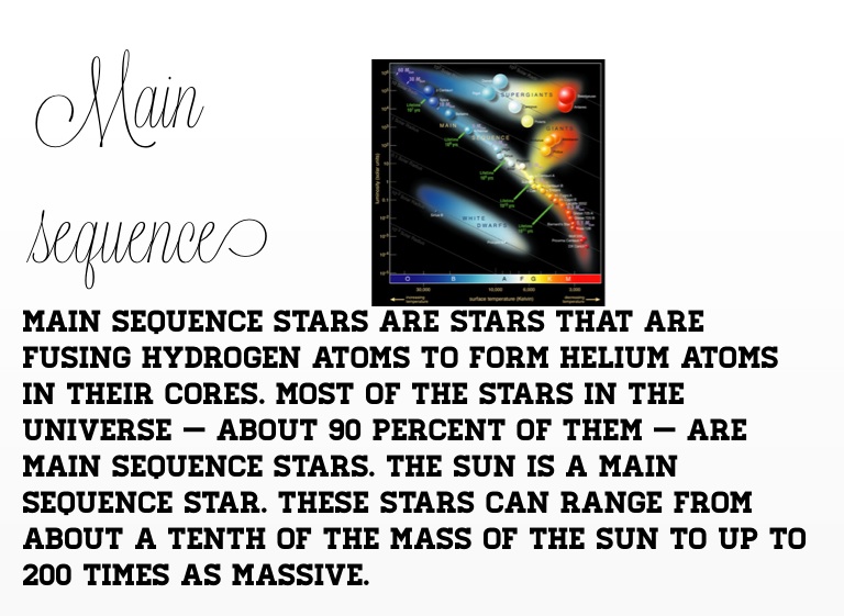 Main sequence stars are stars that are fusing hydrogen atoms to form helium atoms in their cores. Most of the stars in the universe — about 90 percent of them — are main sequence stars. The sun is a main sequence star. These stars can range from about a tenth of the mass of the sun to up to 200 times as massive.