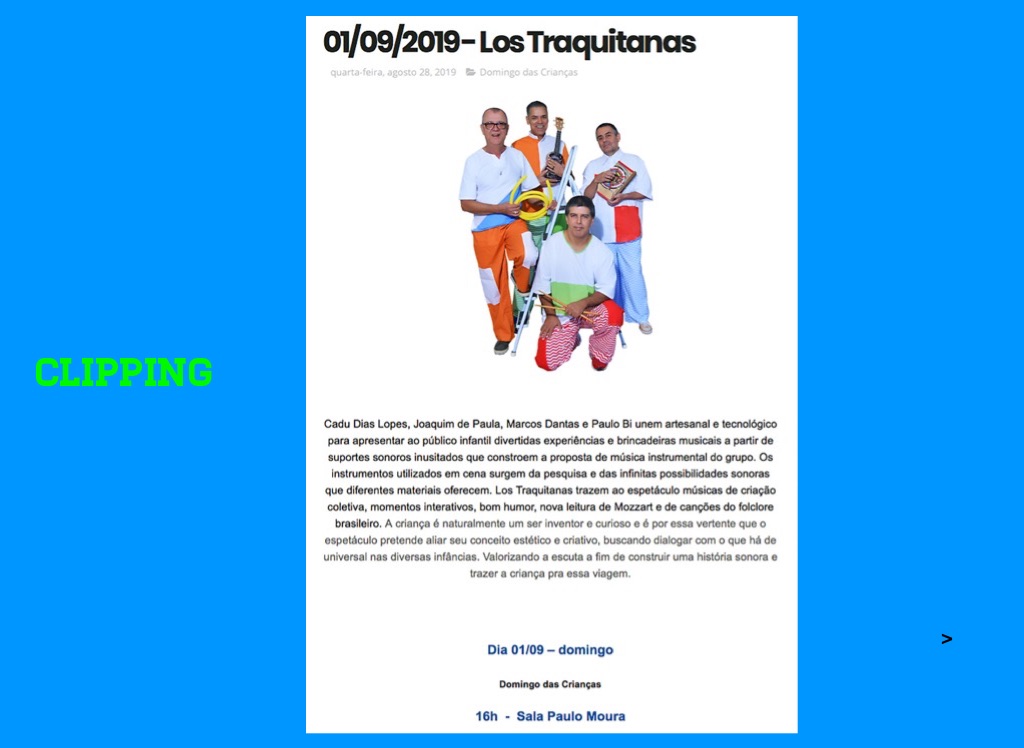 O trio formado por Joaquim de Paula, Marcos Dantas e Paulo Bi, faz uso de várias traquitanas sonoras, para apresentar ao público infantil divertidas experiências e brincadeiras musicais.