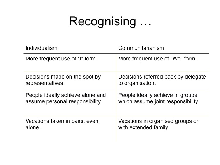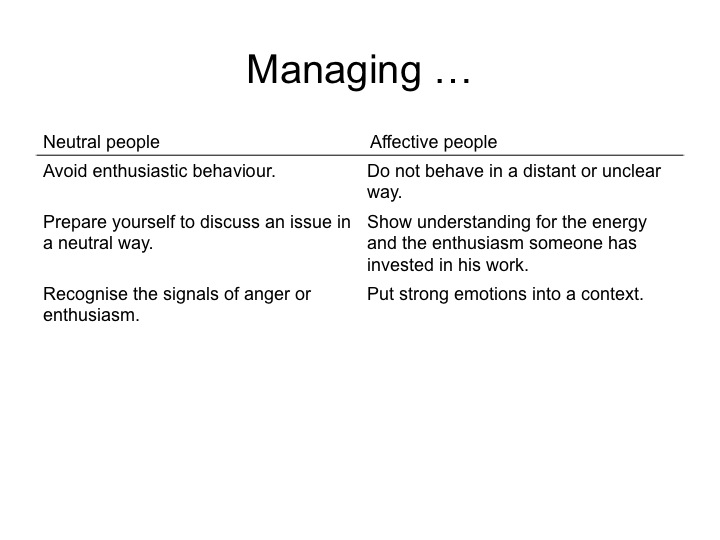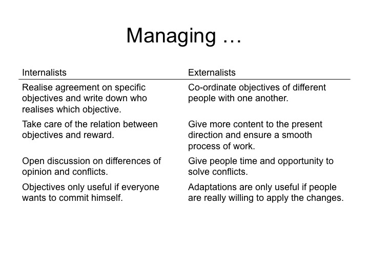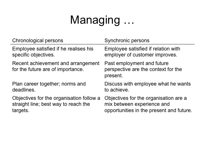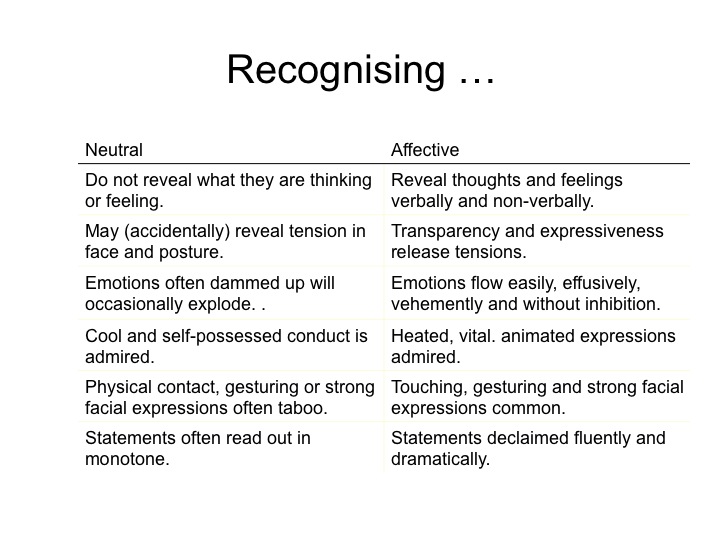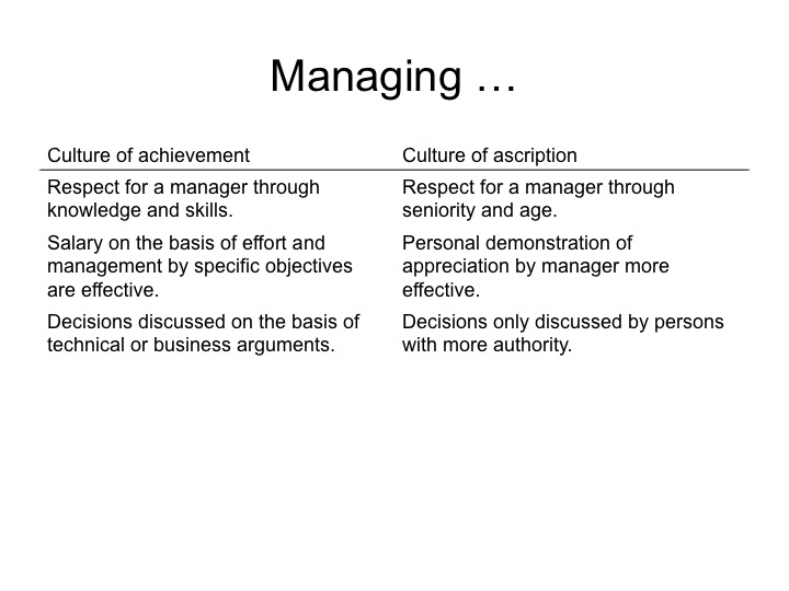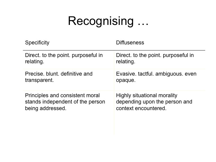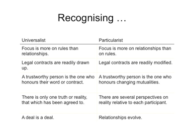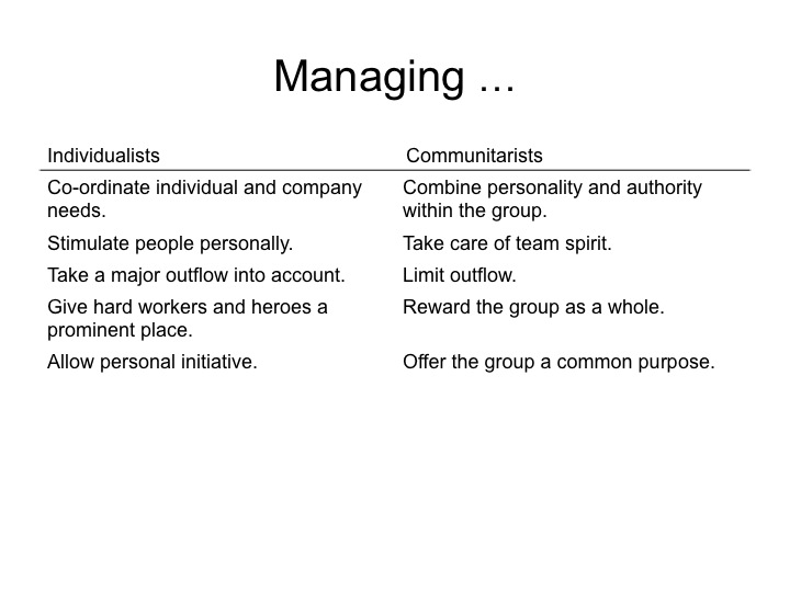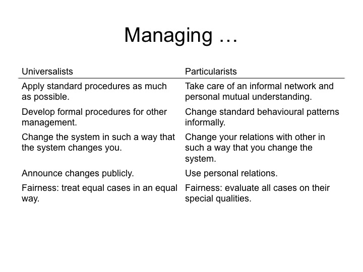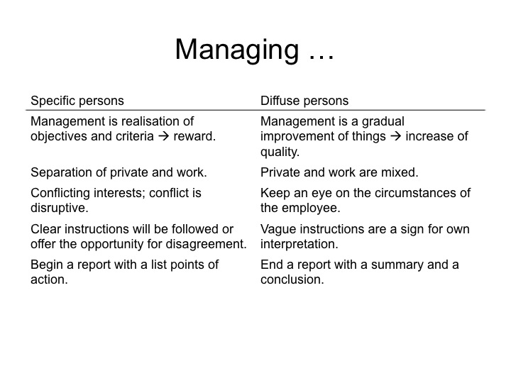 Although the scores by country are not freely available, Trompenaars mentions how you may recognize people according to each dilemma; key points per dilemma, included in the stack on the left. Following these seven lists, another set of seven lists has been included on how to manage people according to each dilemma. At the same time those lists also highlight your own position through your preferences.