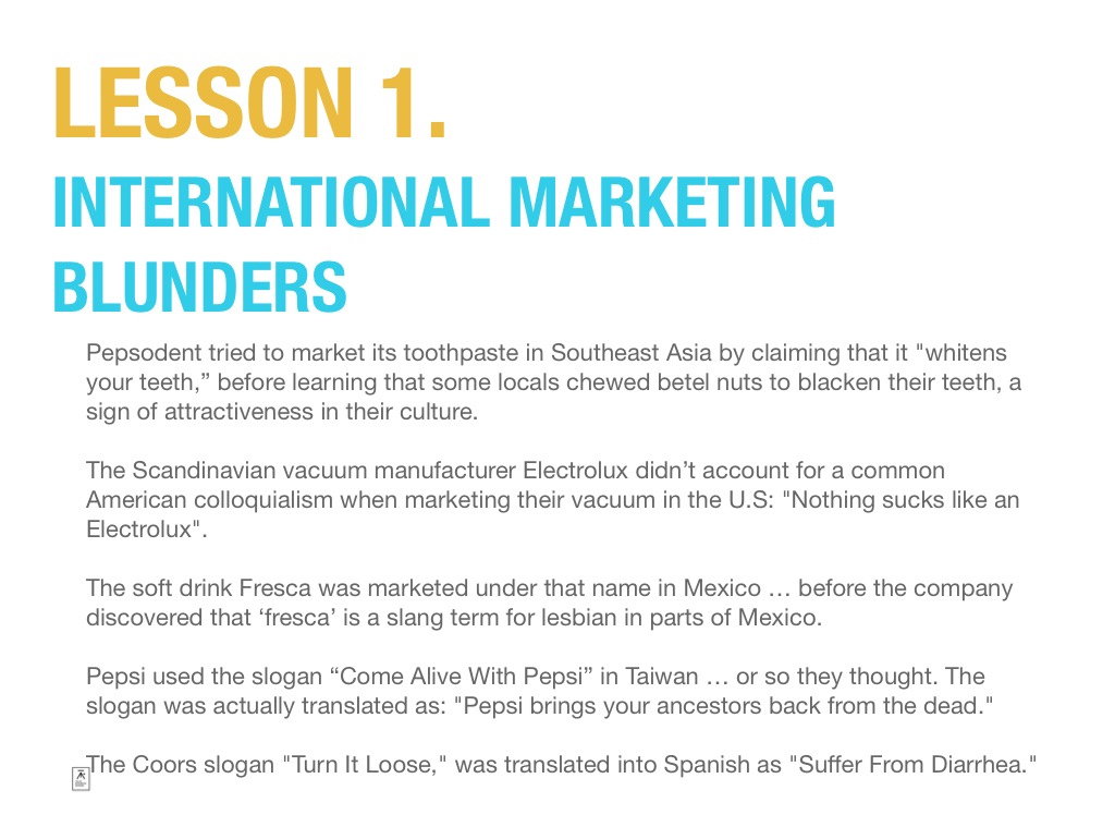 Pepsodent tried to market its toothpaste in Southeast Asia by claiming that it "whitens your teeth,” before learning that some locals chewed betel nuts to blacken their teeth, a sign of attractiveness in their culture.