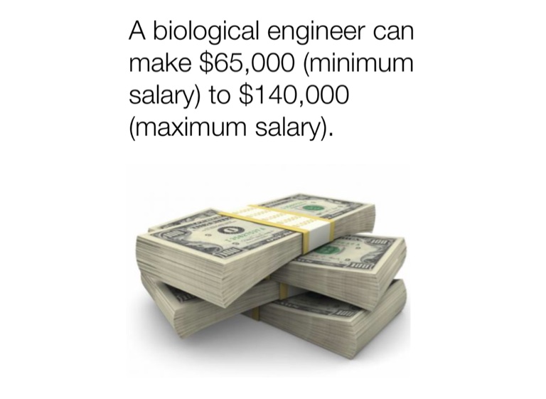 A biological engineer can make $65,000 (minimum salary) to $140,000 (maximum salary).