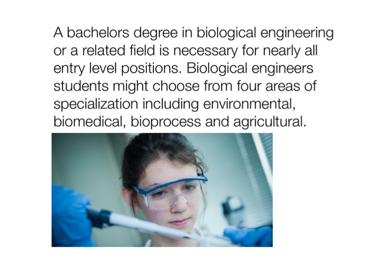 A bachelors degree in biological engineering or a related field is necessary for nearly all entry level positions. Biological engineers students might choose from four areas of specialization including environmental, biomedical, bioprocess and agricultural.