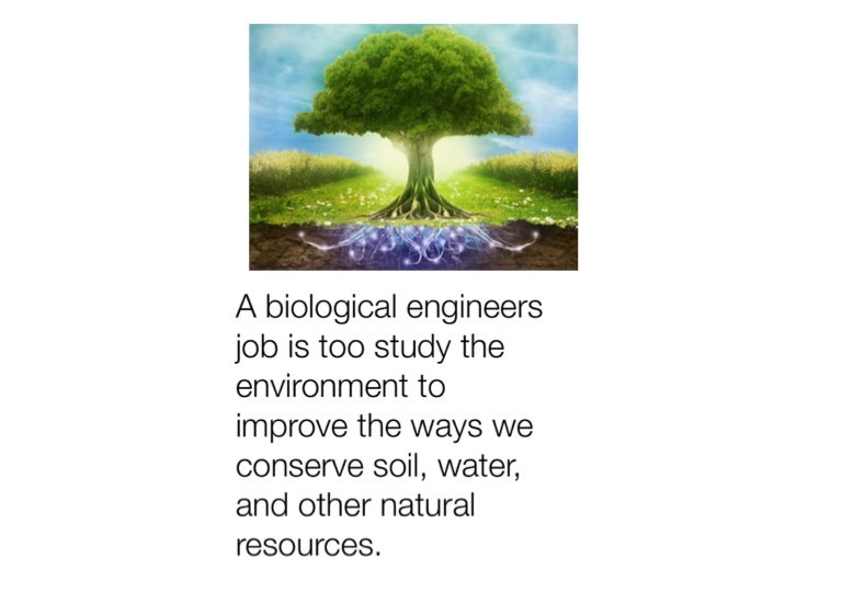A biological engineers job is too study the environment to improve the ways we conserve soil, water, and other natural resources.