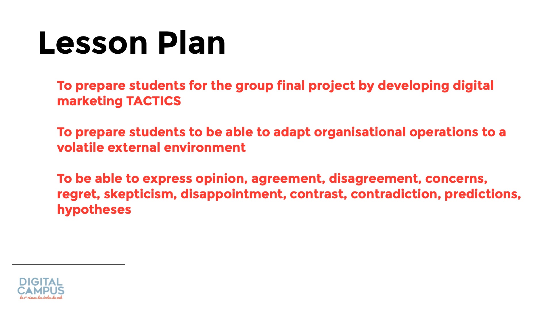 To prepare students for the group final project by developing digital marketing TACTICS