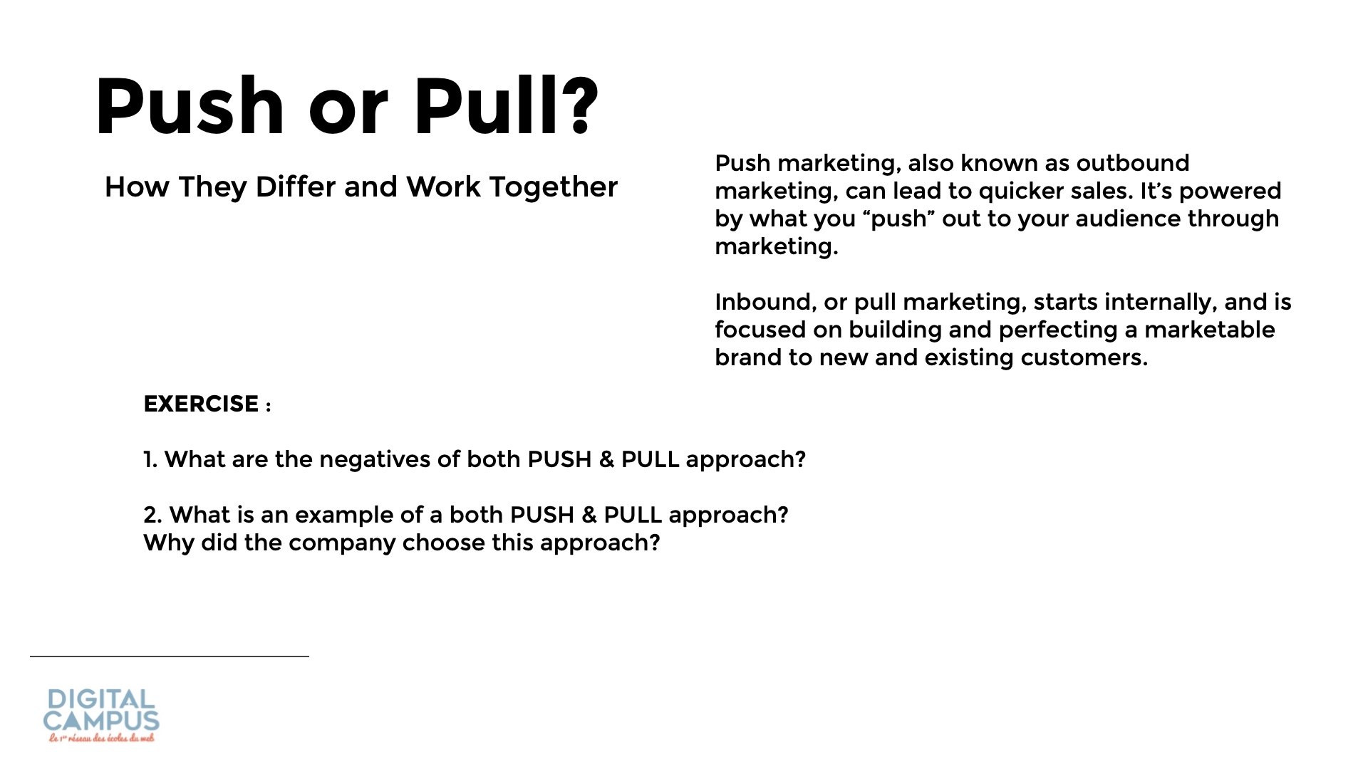 Push marketing, also known as outbound marketing, can lead to quicker sales. It’s powered by what you “push” out to your audience through marketing.