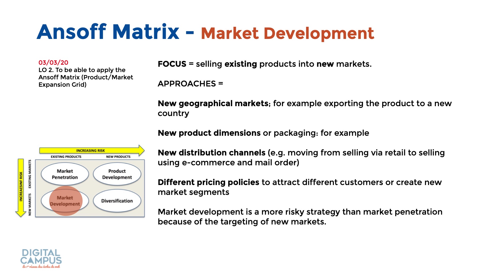 Market development is a more risky strategy than market penetration because of the targeting of new markets.
