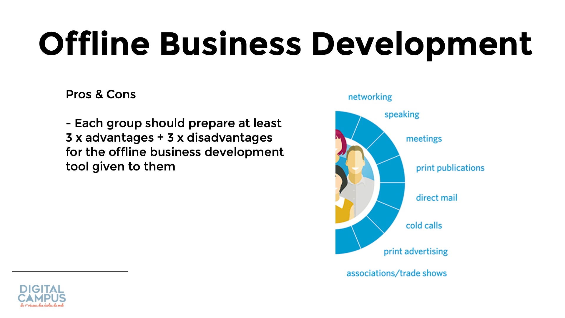- Each group should prepare at least 3 x advantages + 3 x disadvantages for the offline business development tool given to them