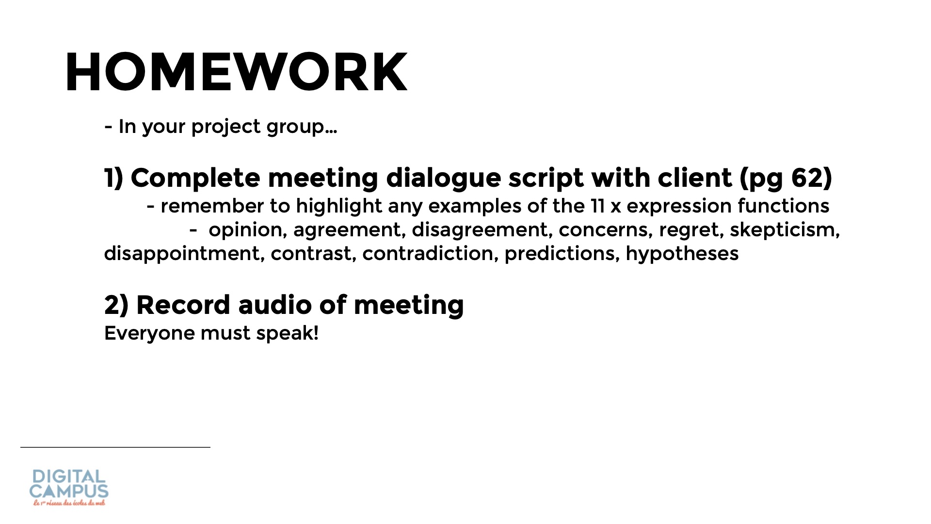 1) Complete meeting dialogue script with client (pg 62)