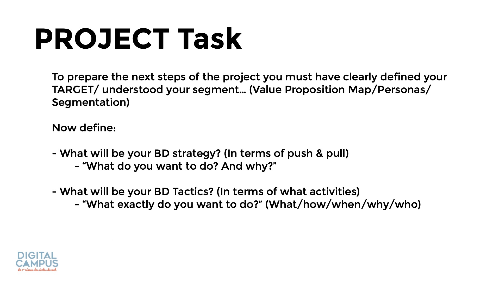 - What will be your BD Tactics? (In terms of what activities)