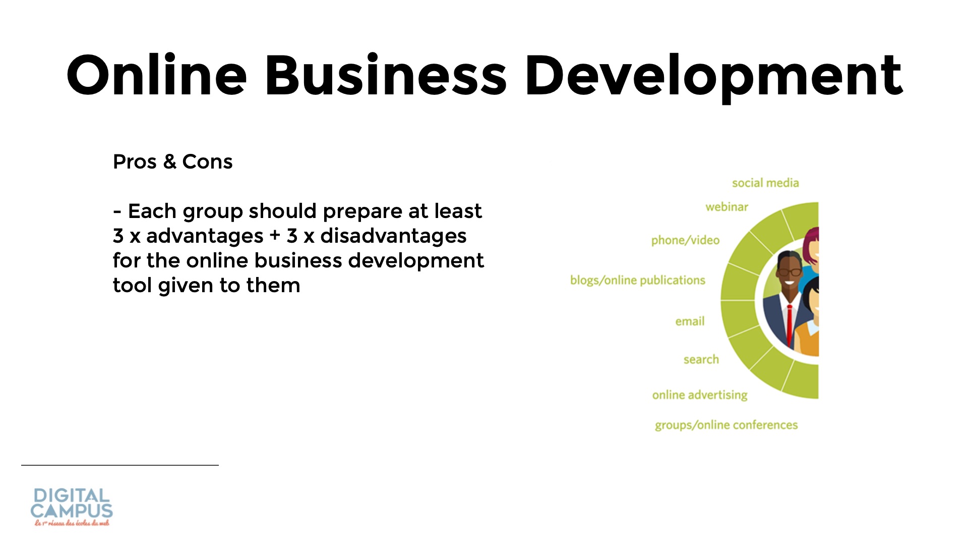 - Each group should prepare at least 3 x advantages + 3 x disadvantages for the online business development tool given to them