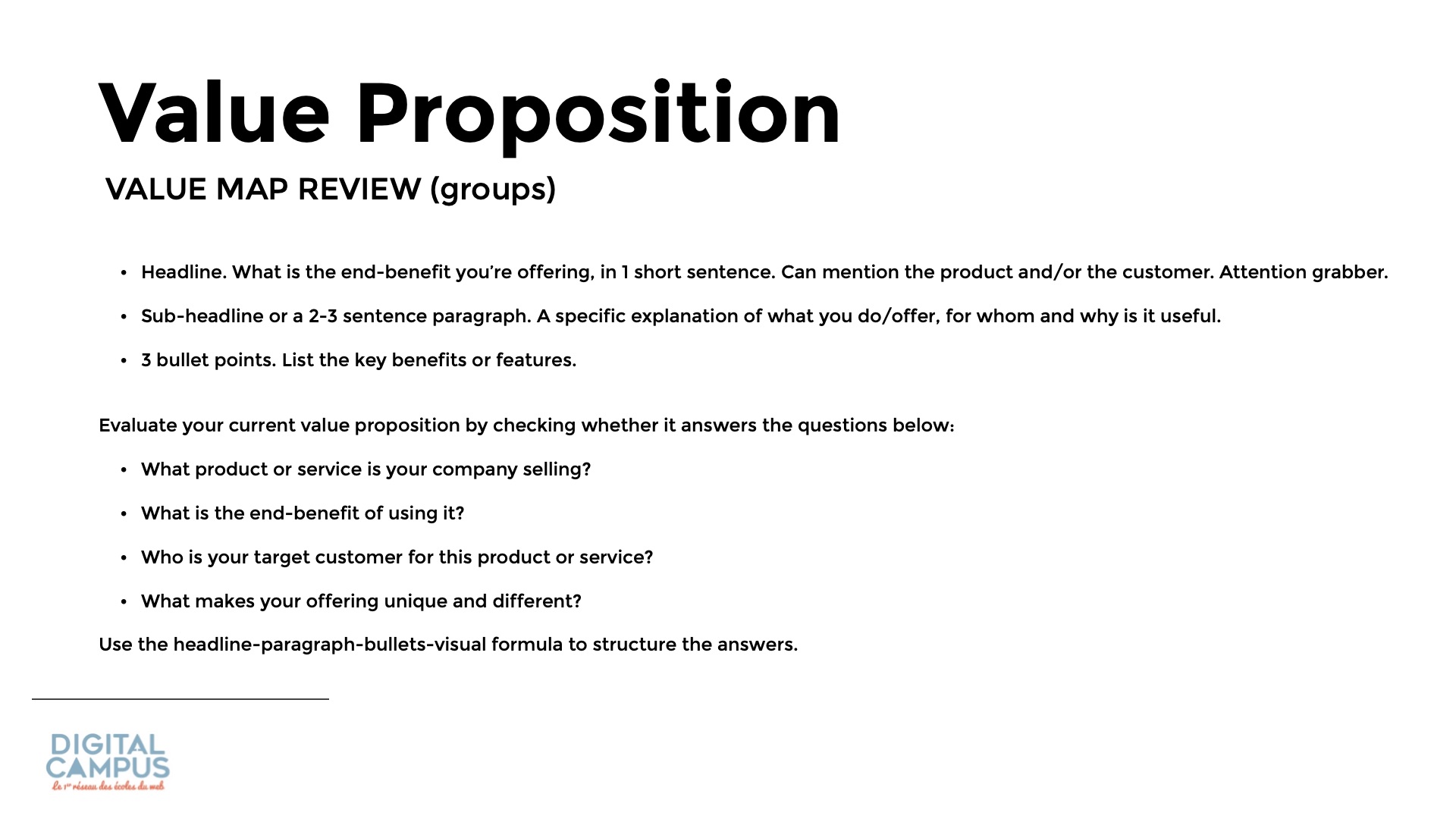 Evaluate your current value proposition by checking whether it answers the questions below: