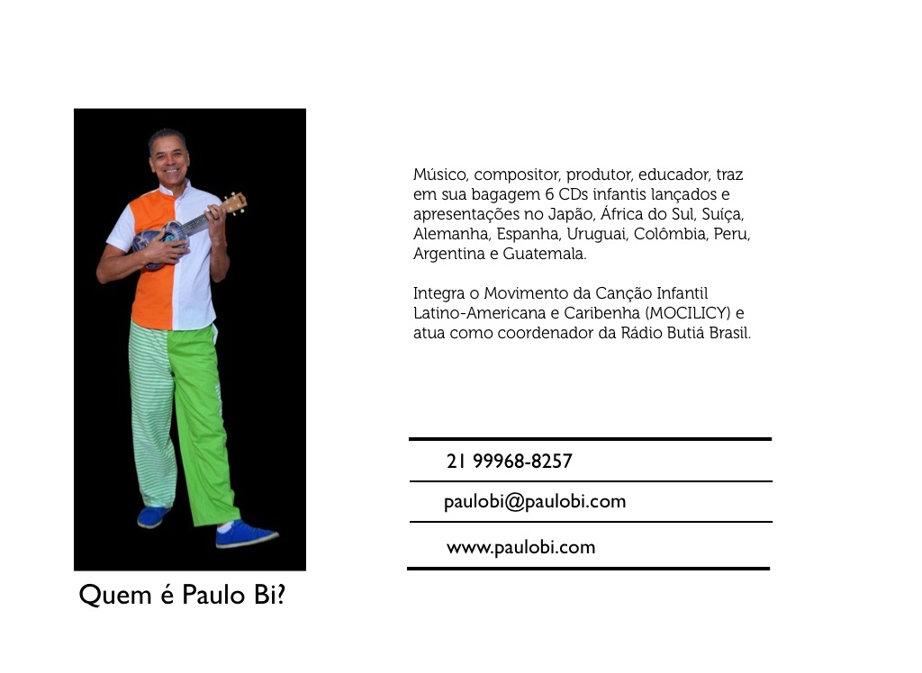Músico, compositor, produtor, educador, traz em sua bagagem 6 CDs infantis lançados e apresentações no Japão, África do Sul, Suíça, Alemanha, Espanha, Uruguai, Colômbia, Peru, Argentina e Guatemala.