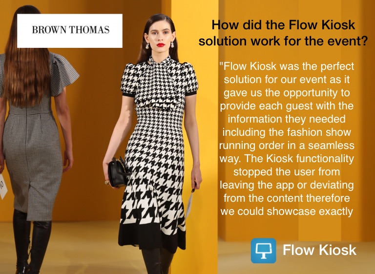 "Flow Kiosk was the perfect solution for our event as it gave us the opportunity to provide each guest with the information they needed including the fashion show running order in a seamless way. The Kiosk functionality stopped the user from leaving the app or deviating from the content therefore we could showcase exactly what we wanted them to see."