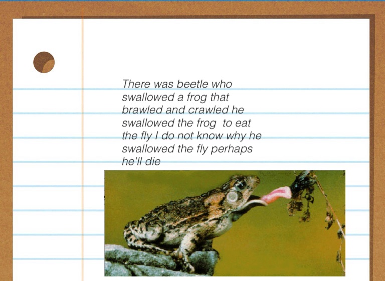 There was beetle who swallowed a frog that brawled and crawled he swallowed the frog to eat the fly I do not know why he swallowed the fly perhaps he'll die