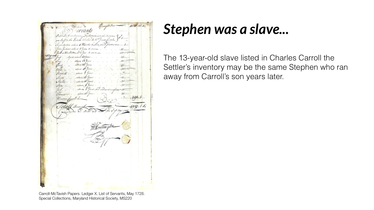The 13-year-old slave listed in Charles Carroll the Settler’s inventory may be the same Stephen who ran away from Carroll’s son years later.