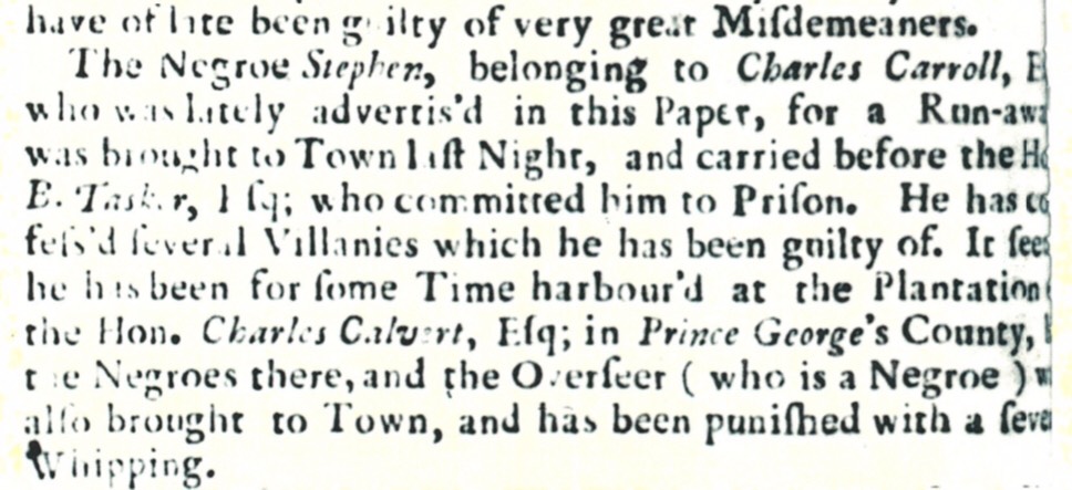 About a month after running away, Stephen was captured on Captain Charles Calvert’s plantation. He was imprisoned in Annapolis, and Calvert’s black overseer was whipped for helping him.