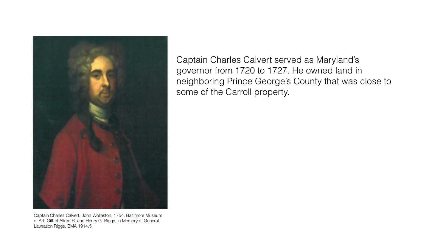 Captain Charles Calvert served as Maryland’s governor from 1720 to 1727. He owned land in neighboring Prince George’s County that was close to some of the Carroll property.